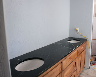 Now, the kitchen counters. This is soapstone that has not been oiled yet. It comes gray (or green) like this and once oiled the details stand out. I will have photos tomorrow of the oiled counters!